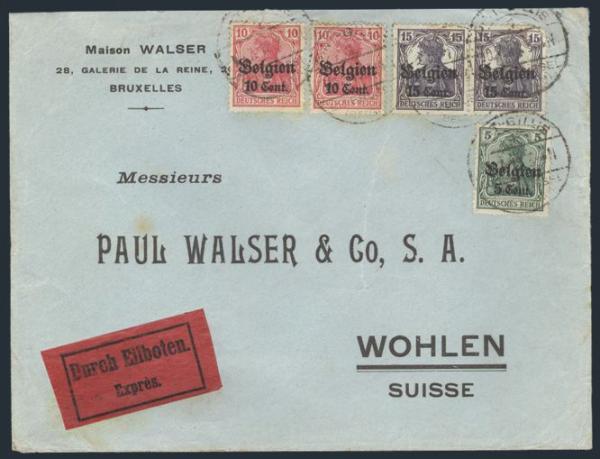 (2), N16 (2), Tied on WWI German Occupation Express cover to Wohlen, Switzerland. F-VF (Image)