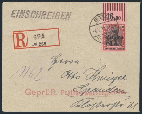margin imprint copy tied by Spa 4 July 1918 CDS on Reg'd Censored WWI German Occupation cover. Addr to Spandau, Germany. VF. Cat $115 US (Image)