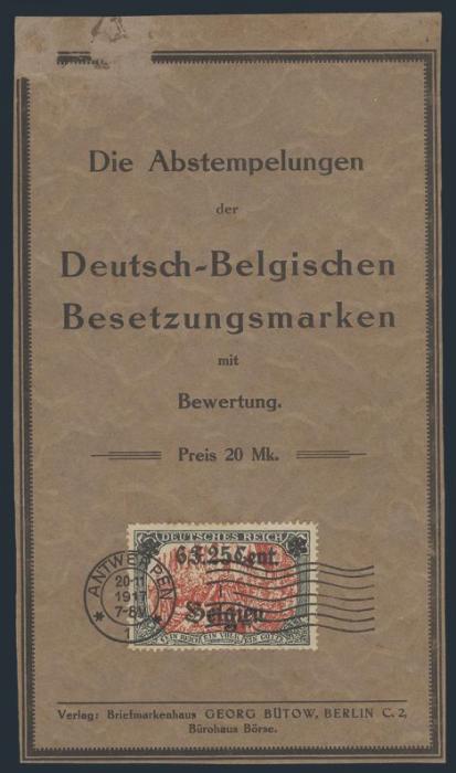 Georg Butow, Berlin Catalogue (outside cover only) circa 1920. Has a large size replica of #N25 "tied" by printed Antwerp cancel. F-VF, corner flaw. Interesting collateral item