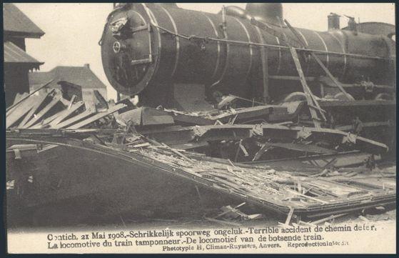 postcard depicting the 21 May, 1908 wreck of a RAILWAY TRAIN at Kontich, Belgium. VF (Image)