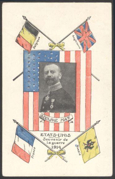 Brussels 1914 CDS on WWI multi-coloured patriotic postcard depicting FLAGS OF THE ALLIES and central portrait of ADOLPHE MAX who was a Belgian politician and Mayor of Brussels from 1909-39 (Image)