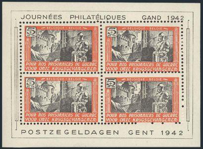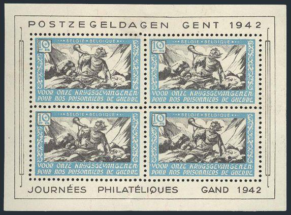 1602   imageSet of 4 diff cinderella souvenir sheets of 4 stamps issued in Ghent Belgium 1942 for WWII PRISONERS OF WAR. VF, ungummed, one tiny selvedge tear (Image) Estimate 100.00+ $Cdn