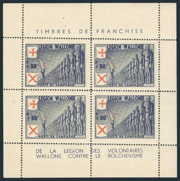 1605   imageSet of 4 diff WWII WALLOON LEGION souvenir sheets from 10 Ap 1942. These were issued for the Volunteer Legion in the German military fighting against Bolshevism. Each with printed serial numbers on selvedge on the reverse. Fresh, VF, NH (Mi #'s I-IV, Cat 640 Euro) (Image) Estimate 400.00+ $Cdn