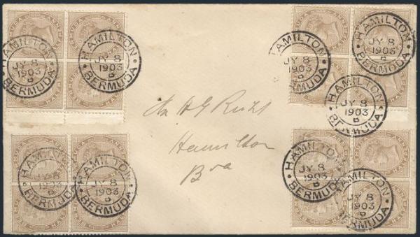 1621 16 image16 (4 blocks), Tied by Hamilton 8 July 1903 CDS's on each corner of a cover addr locally. F-VF. Eye-catching QV cover! (Image) Estimate 75.00+ $Cdn
