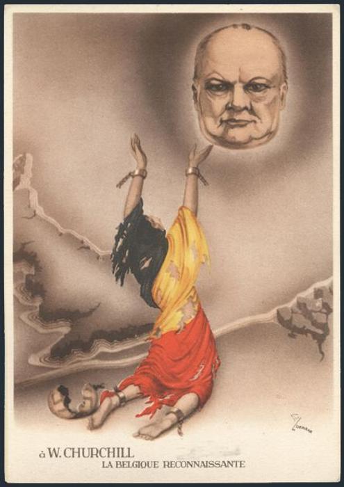 1603   imageUnused colour illustrated WWII Patriotic postcard depicting map of Belgium & Gr. Britain. Has female effigy in Belgian colours with broken shackles showing gratitude to WINSTON CHURCHILL. VF (Image) Estimate 75.00+ $Cdn