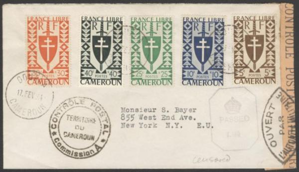 1762 282-6 image282-6, Tied by Douala 17 Feb 1944 CDS's on WWII Censored cover to New York. Has French censor tape & h/s, plus British censor h/s. VF. Attractive (Image) Estimate 65.00+ $Cdn