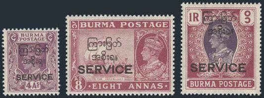 1752 31 31, Three singles and 4 strips of 3 of the KGVI Two Rupee. Most stamps show varying degrees and locations of extra dark violet ink around Burma Postage. F-VF, some with light aging on gum Cat 240.00+