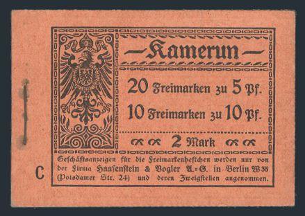 1757 21a, 21b, 22a image21a (3), 21b, 22a, Rare complete mint German Colonial 2 Mark Booklet circa 1905, containing 5 panes. VF looking from the front, scuff on reverse cover, NH. VERY SCARCE WITH VERY FEW INTACT BOOKLETS KNOWN (Mi #MH2A, Cat 6,000 Euro or $9,750 Cdn) (Image) Estimate 2,000.00+ $Cdn