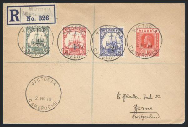 1760 54-6 image54-6, Along with Nigeria #2, all neatly tied by Victoria 2 Nov, 1919 CDS's on Reg'd cover to Bern Switzerland (rec b/s). Has Liverpool transit b/s. VF. A SCARCE MIXED FRANKING (Image) Estimate 200.00+ $Cdn