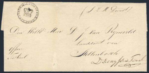 1765   imageStampless 19th Century folded Official cover with a superb strike of the circular crown "GENERAL POST OFFICE CAPETOWN" h/s. Addr to Stellenbosch. VF (Image) Estimate 125.00+ $Cdn