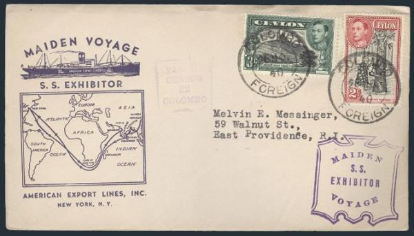 1833 278-9 image278-9 (2), Tied by Colombo 12 & 26 Nov 1940 CDS's on 2 diff cach American Export Lines First Voyage covers to USA for "SS Exemplar" & SS Exhibitor". Has ships h/s's. One has censor h/s. F (2 covers) (Image) Estimate 50.00+ $Cdn
