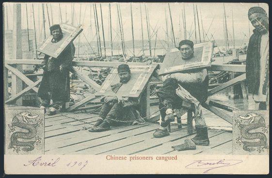 1849   imageUnused b/w postcard 1907 depicting CHINESE PRISONERS who are cangued in wooden stocks and chained together. Cangue was a device that was used for corporal punishment in China, & the prisoners often relied on passersby for food. F (Image) Estimate 60.00+ $Cdn