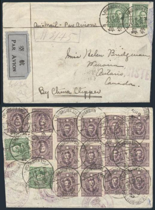 1845 299, 317 image299 (4), 317 (19), Tied front & back by Junghsien 10 Aug 1937 CDS's on Reg'd Airmail cover to Canada "By China Clipper". F, reduced affecting 1 stamp but still an attractive item (Image) Estimate 75.00+ $Cdn
