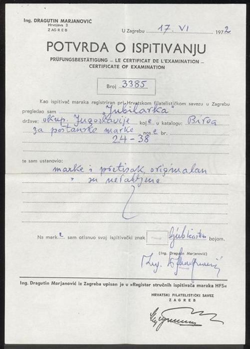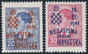 1885   imageYugoslavia #'s 142-54, Complete 1941 set of 15 diff King Peter issues overprinted "NEZAVISNA DRZAVA HRVATSKA 10. IV. 1941" with a small shield in red or blue. Fresh, F-VF, NH. ONLY 5,000 SETS MADE. Each stamp has guarantee b/s and the set has a 1972 Dragutin Marjanovic Certificate (Mi #393-407, Cat 1,500 Euro) (Image) (View Certificate)