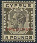 1899 109 image109, KGV FIVE POUND High Value with red "SPECIMEN" overprint, nicely centered, fresh, VF, OG (Image) Estimate 1,250.00+ $Cdn