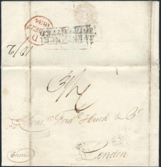1886   imageStampless folded letter datelined Havana 15 Oct, 1834 addr to London England, rated "3/4". On reverse has a stepped boxed "PENZANCE SHIP LETTER" and English 27 Dec, 1834 rec cancel. F (Image) Estimate 200.00+ $Cdn