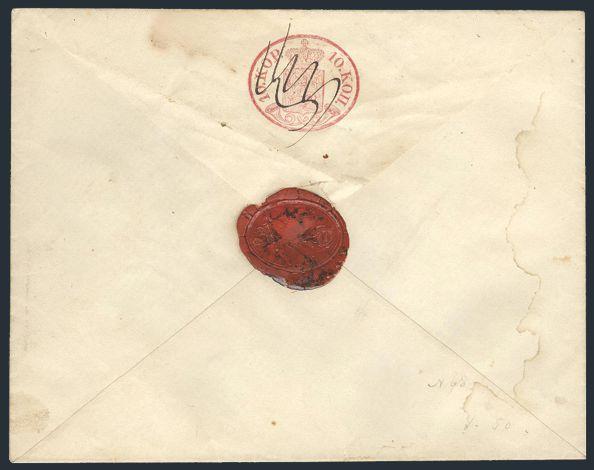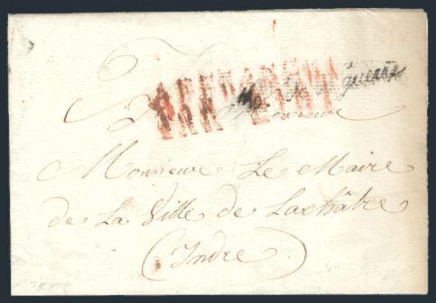 2057   imageStampless Official Military part printed folded letter dated Paris 2 Mar 1815. Free-franked with bold red "AFFRANCHI / PAR ETAT" h/s addr to the Mayor of Ville de La Chatre. Has attractive official illustrated b/s. Contents request info on the fate of a soldier who fought in the Napoleonic war in Russia, 1812. F. Historic (Image) Estimate 75.00+ $Cdn