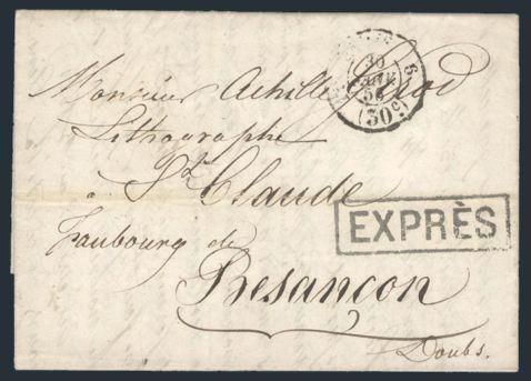 2059   imageStampless 1856 folded letter with (Paris) 2-Ring Postage Due / 30¢ / Route 6 strike to Besancon (rec b/s). Has bold boxed "EXPRES" h/s & Paris to Lyon RPO cancel. F-VF (Image) Estimate 45.00+ $Cdn