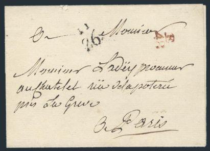 2054   imageStampless folded "Petite-Post" of Paris local letter dated 26 Dec 1778. Has black inverted "T/26" strike & "E/48" red strike. F-VF (Image) Estimate 50.00+ $Cdn