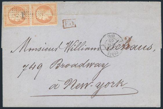 2069 27 image27 (Pair), Tied by dotted rectangular # "1" numeral cancel on folded Trans-Atlantic letter to New York. Has Paris 22 Nov 1865 CDS. F-VF, horiz crease affected stamps slightly (Image) Estimate 80.00+ $Cdn