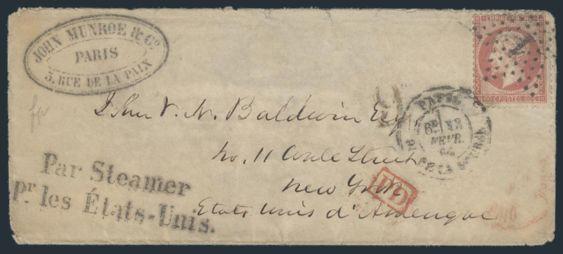 2070 28 image28, Tied by Paris 12 Feb 1864 CDS & Star dotted numeral "1" strike on Trans-Atlantic cover to New York. Has John Monroe & Co. corner card & "Par Steamer / pr. les Etats-Unis" h/s. F, some soiling (Image) Estimate 75.00+ $Cdn