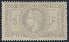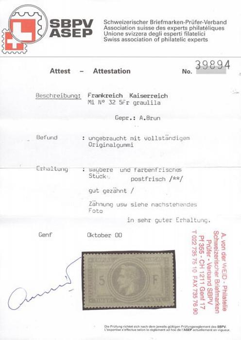 2072 37 image37, Rare mint 5Fr High Value, well centered, strong impression, nice perforations, VF, disturbed OG. Has guarantee b/s and 2000 Von Der Weid Certificate (Image) (View Certificate)