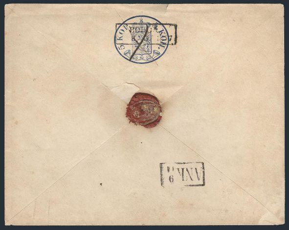 2051   imageCoat of Arms 5 KoP blue oval imprinted Postal Stationery envelope (H&G #3), with Borga 8 Nov 1857 boxed cancel to Helsinki. Has "ANK 9/11" h/s & "11" m/s rate. F-VF, small edge tear. Scarce (Image) Estimate 300.00+ $Cdn