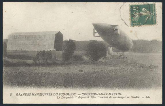 by 1912 RPO cancel on front of b/w photo postcard to Clion / Indre; 18 Dec 1912 receiver. Depicts Dirigible "Adjutant Reau" leaving its hangar"; Grand South West Maneuvers. F-VF (Image)
