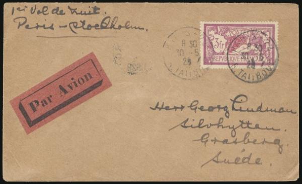 Pre-print paper crease at right tied by Paris 30 May 1929 CDS's to FFC PARIS TO STOCKHOLM SWEDEN with transits and receiver on reverse. F, corner crease (Image)