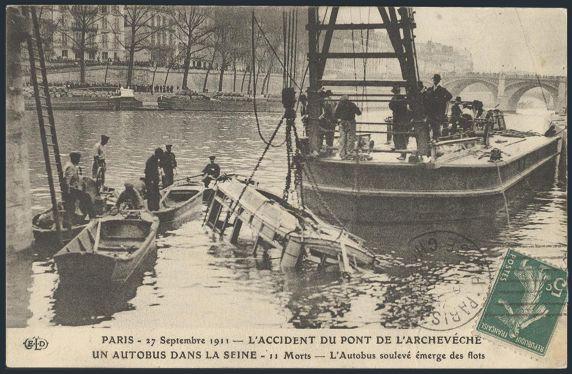 by Paris CDS on b/w photo postcard depicting the SALVAGE OPERATIONS OF A SUBMERGED BUS IN THE SEINE RIVER 27 Sept 1911. This was a terrible accident causing 11 deaths. F, stamp faulty from being placed too close to the edge (Image)