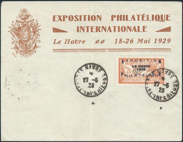 HAVRE PHILATELIC EXPOSITION neatly tied by Le Havre Expo cancel 27 May, 1929 CDS on unaddr illustrated advertising Exposition cover. F, the cover has a harmless centre fold not affecting the stamp (Image)