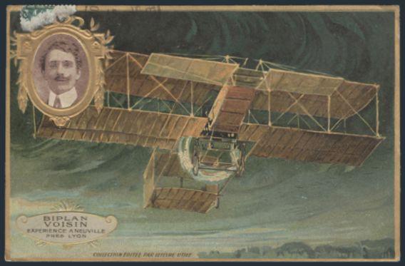 on fancy multi-coloured postcard circa 1908 depicting an early VOISIN BIPLANE in flight with inset portrait of GABRIEL VOISIN. This plane was Europe's first successful powered aircraft. F (Image)