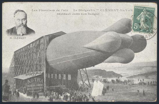 by 1909 CDS on b/w postcard depicting the CLEMENT-BAYARD AIRSHIP DIRIGIBLE along with his inset portrait. Shows the giant airship in a hangar. F, some soiling