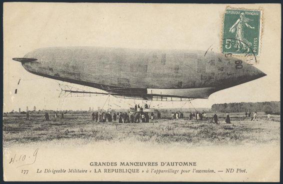 by 1909 CDS on b/w postcard depicting the Military Dirigible "LA REPUBLIQUE". She was built for the French military & had a short-lived career of just over 1 year when it crashed in 1909 due to mechanical failure killing all its crew. F (Image)