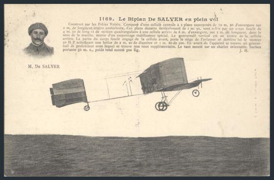 by Troyes 3 July, 1910 CDS on b/w postcard depicting pioneer aviation Pilot DE SALVER & his early Voisin aircraft in flight. F (Image)
