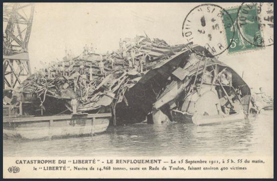 by 1912 CDS on b/w postcard depicting the wreck of the French Battleship "LIBERTE" 25 Sept, 1911. The ship was accidentally destroyed on that day. A fire broke out in one of the ship's propellant magazines resulting in an explosion which destroyed