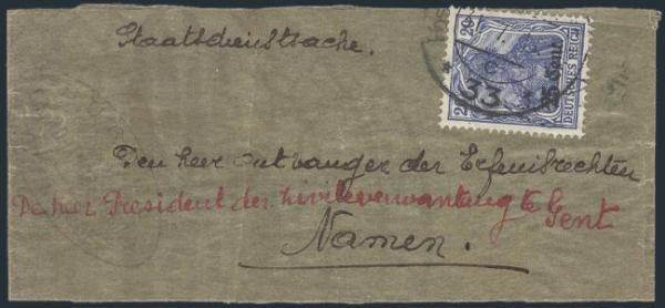 by Postuberwachungsstelle / 33 circa 1916 CDS on WWI German Occupation small size glassine envelope to Namen (Namur), Belgium. F-VF. VERY UNUSUAL ITEM (Image)