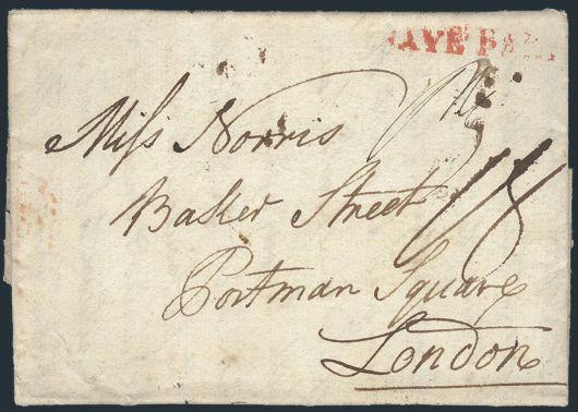 Century stampless folded letter from a brother to his sister in London. Has red "PAYE PARIS" cancel plus other postal markings. Fascinating contents where the writer refers to his acting as an agent to retrieve monies due from a British owned