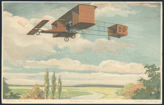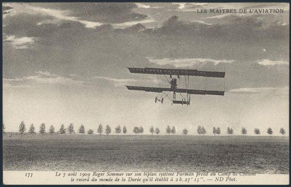 postcard depicting early aviator ROGER SOMMER in his Farman biplane. He broke the record for world flight duration on 7 April, 1909. F (Image)
