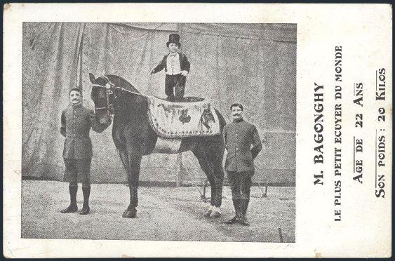 circus postcard circa 1910 depicting M. BAGONGHY - the smallest squire of the world at 20 kilos. Shows the dwarf on top of a horse. F (Image)