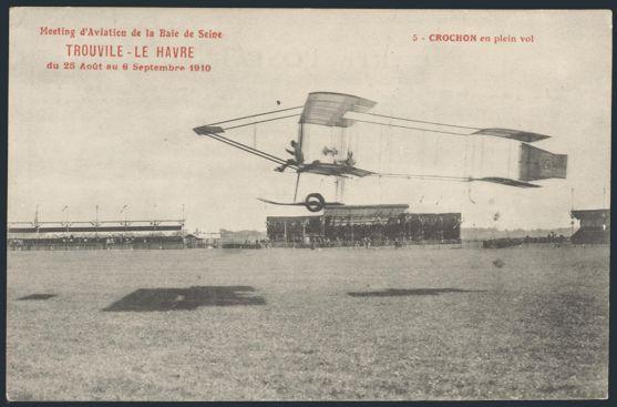 unused b/w postcards depicting scenes from the 1910 Trouvile-Le Havre Aviation Meet. These show pioneer pilots Latham & Crochon with their planes. F-VF (Image)