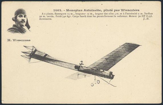 postcard circa 1910 depicting pioneer pilot Wiencziers flying in an early Antoinette Monoplane. VF (Image)