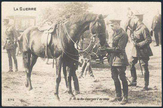 real photo WWI postcard depicting British KING GEORGE V in France in military uniform (standing with a horse) while visiting troops at a Military Camp. F (Image)