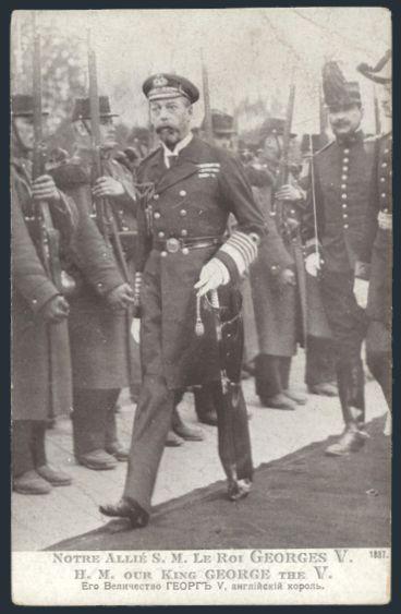 b/w photo postcard 1914 depicting England's KING GEORGE V in full uniform walking in a military ceremony. F (Image)