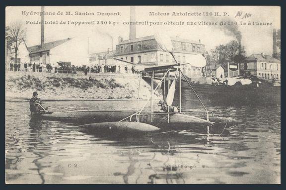 photo postcard circa 1910 depicting SANTOS DUMONT & his pioneer HYDROPLANE. Dumont was a Brazilian aeronaut & inventor. He contributed significantly to the early development of aircraft. VF (Image)