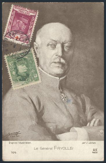 postcard depicting French GENERAL EMILE FAYOLLE. He was a major French military officer during the War and a diplomat and became a Marshal of France. Has diff charity labels affixed & cancelled by 1917 CDS's. F (Image)