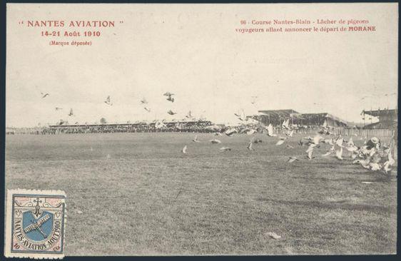 postcard depicting scene from the 1910 NANTES AVIATION MEET showing a multitude of PIGEONS being released. Has special coloured Nantes Aviation 1910 label affixed. F