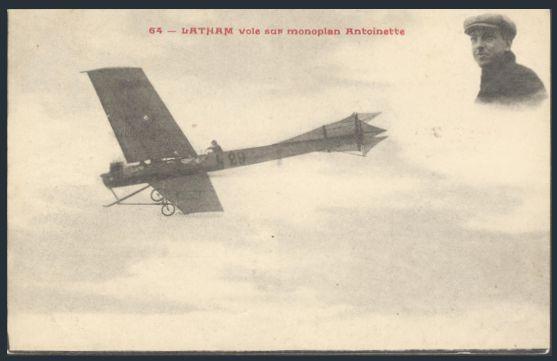 postcard circa 1910 depicting aviation pioneer HUBERT LATHAM in his Antoinette monoplane. He set a world altitude record in 1909 and a world airspeed record in 1910. VF