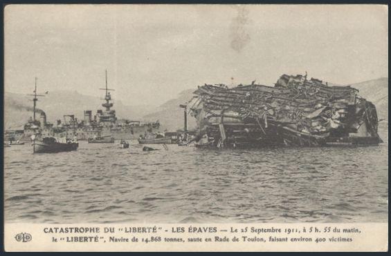 photo postcard depicting the wreck of the French Battleship "LIBERTE" 25 Sept, 1911. The ship was accidentally destroyed on that day. A fire broke out in one of the ship's propellant magazines resulting in an explosion destroying the whole ship. F (Image)