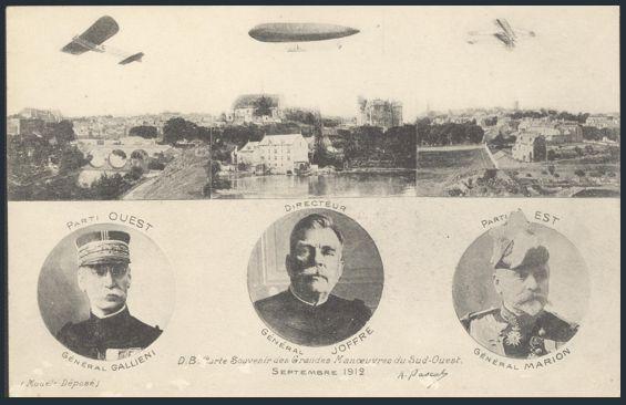 souvenir military postcard of the GRAND MANEUVERS OF THE SOUTH-WEST SEPT 1912. Shows GENERALS GALLIENI, JOFFRE, & MARION; early airplanes in the sky, dirigible, etc. F